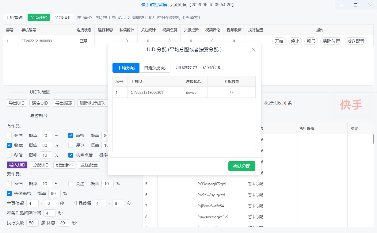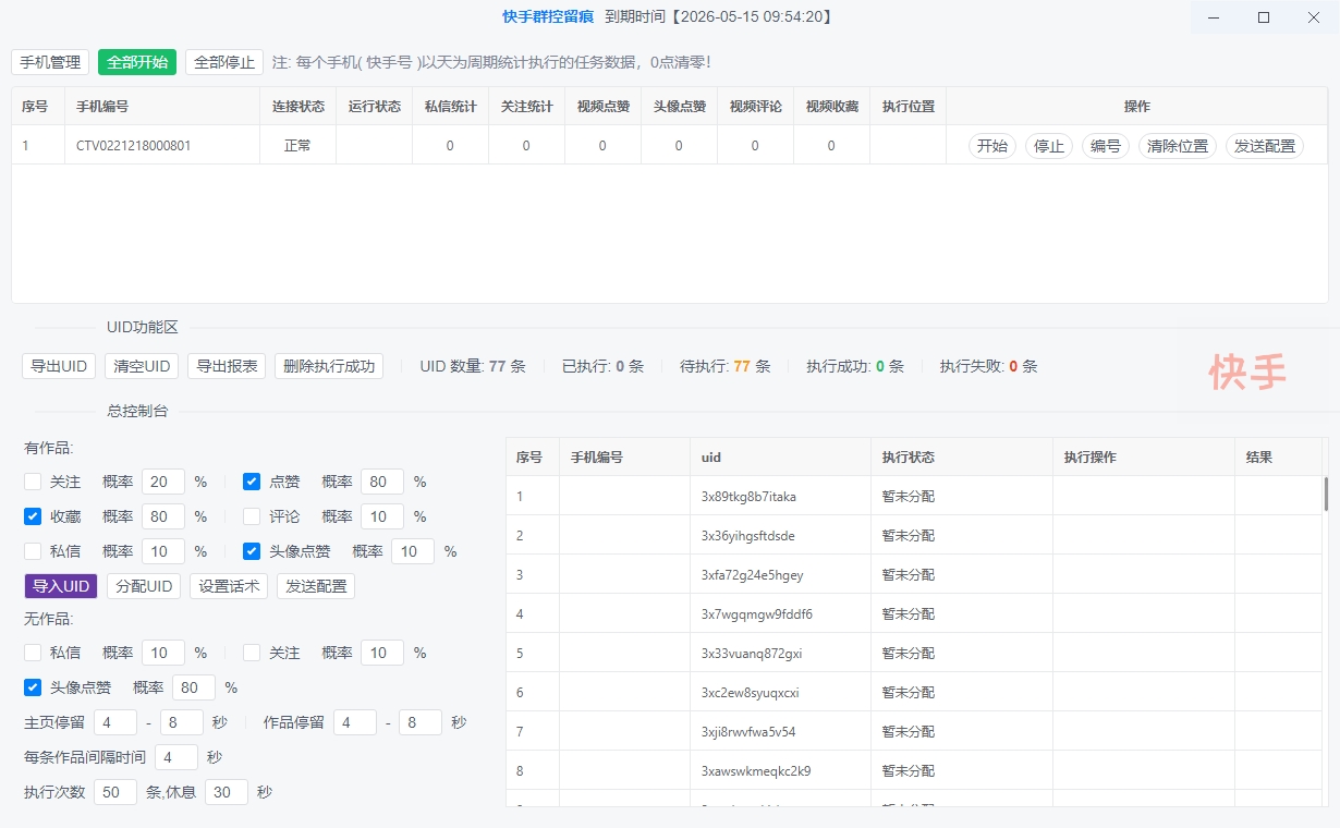 2.只需要导入采集好得快手用户uid数据即可,软件即可连接手机群控全自动化操作。
