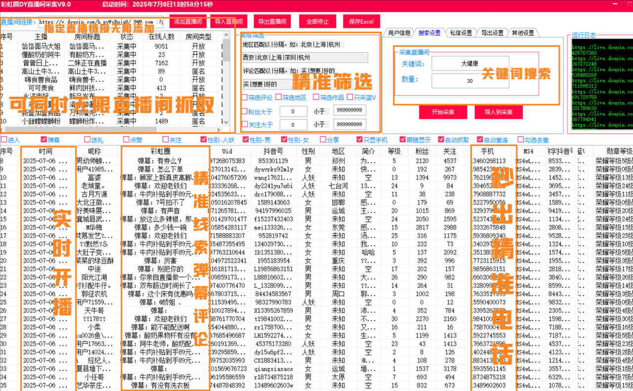 效率: 平均1分钟采集多直播间数据,可达数十万+精准集群,精确投放。
